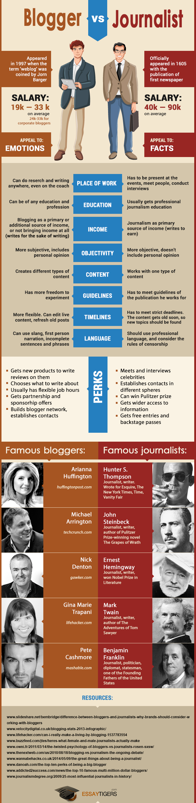 It is time to settle this ultimate confrontation once and forever! The infographic created by our essay writers aims to compare a journalist and a blogger in terms of work environment, salary and perks, writing expertise and other professional peculiarities. Finally, you will see the common and different in these occupations and the question “Blogger vs Journalist:Who is who?” will be solved.